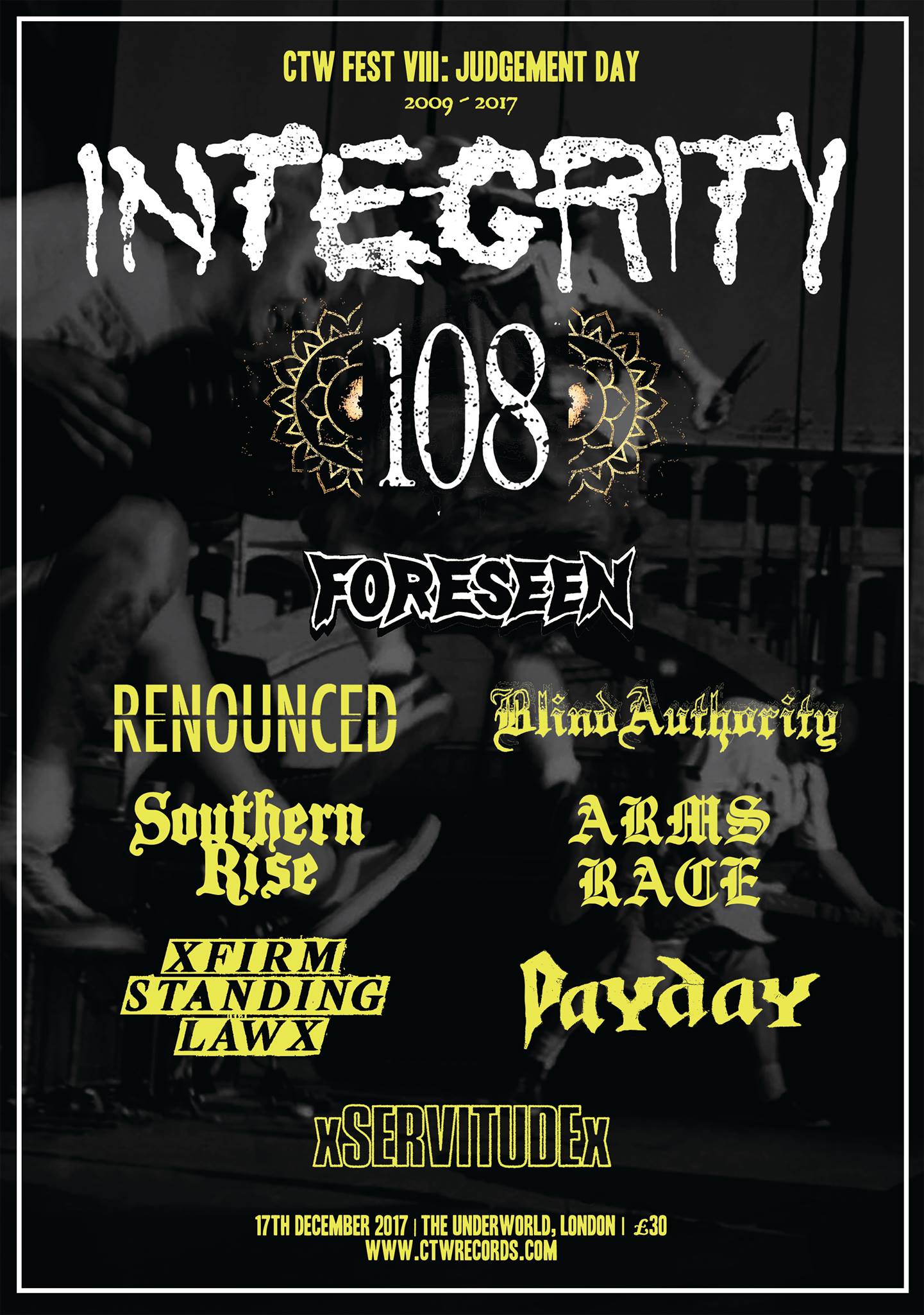 This will coincide with the label who runs the fest, Carry the Weight Records, recently announcing their demise after eight years of being a label. Integrity, 108, Forseen, Renounced, Blind Authority, Southern Rise, Arms Race, Firm Standing Law, Payday and xServitudex will play this last hurrah.