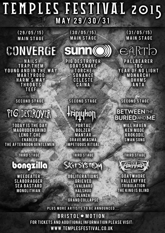 Temples Festival have expanded their already monstrously heavy line-up by adding 15 new bands, including the announcement of Seattle drone masters Earth closing proceedings on the last night. The new bands added also include Pallbearer, Voivod, and some homegrown UK talent in the shape of Ohhms and Swan Song joining the likes of Converge, Between The Buried and Me, Sunno)), Harms Way, Torche and many more across the weekend. The other surprise announcement is that Pig Destroyer will now play twice across the weekend performing two completely different sets on Friday and Saturday respectively. Temples Festival will take place at Motion in Bristol on May 29th, 30th, and 31st, with both Day and weekend tickets available now from the festival website. You can see a full list of the new names added below.