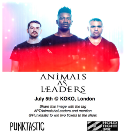 We are giving our readers the chance to win two tickets to the show, where you can marvel at Animals As Leaders out of this world musicianship for yourself. Save the image below, upload it to Twitter and use the hashtag, #PTAnimalsAsLeaders and be sure to @Punktastic in your tweet and we will pick a winner at random.